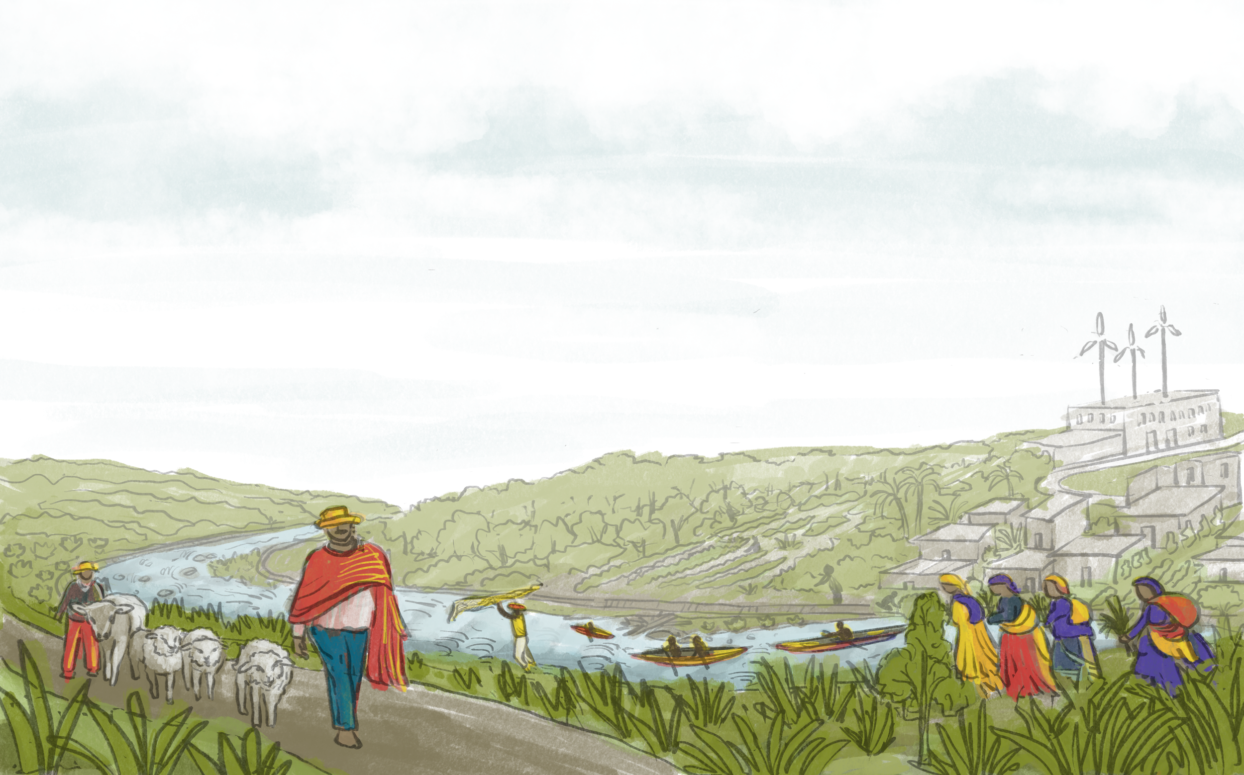 These illustrations envision the process of colonization, extraction and pollution, followed by restoration, reconnection and rematriation of a riverway.