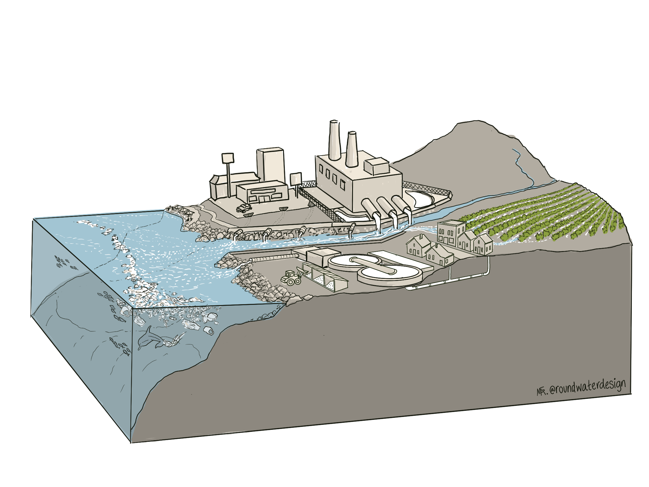 This schematic diagram was developed in collaboration with senior students and their professor Laura Martin at Williams College to visualize local sources of microplastics. Sources of microplastics associated with human waste and applied as sludge on agricultural land were shown in relation to other terrestrial sources such as synthetic textile processing plants, inefficient collection schemes and insufficient waste management facilities.